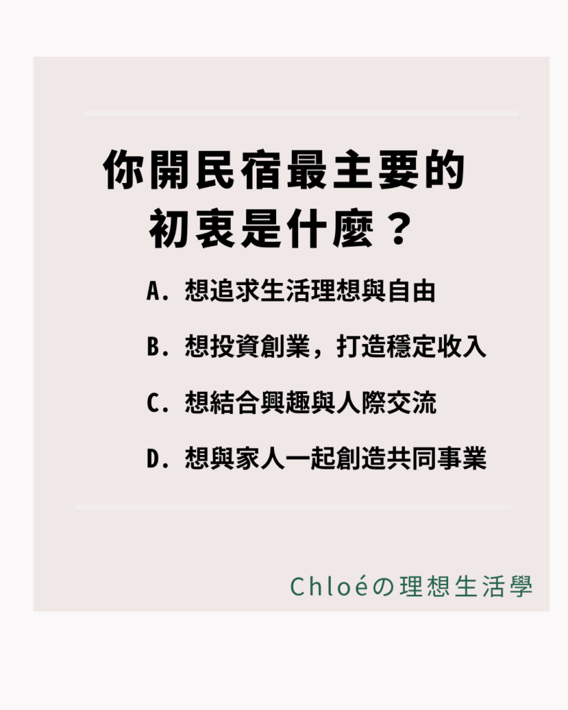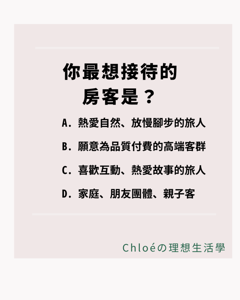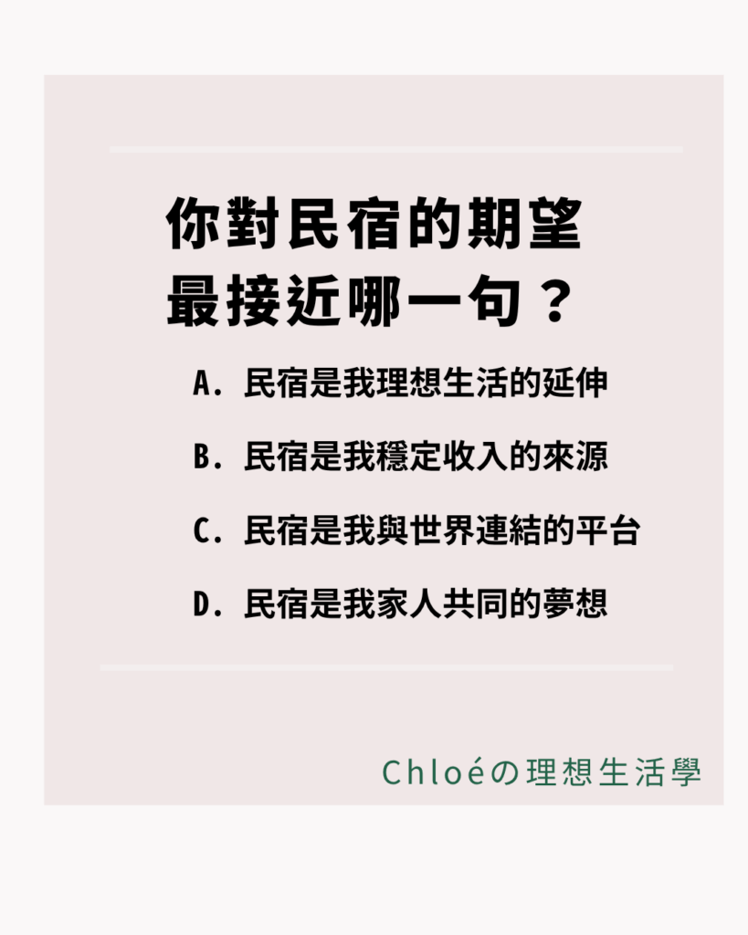 | A 型 | A 選項最多 | 理想生活型 | 重視生活步調與空間氛圍,民宿是理想生活的延伸。 | 建議以「設計感、慢活體驗、場景故事」為核心,營造獨特生活感。收入次要,體驗為主。 |